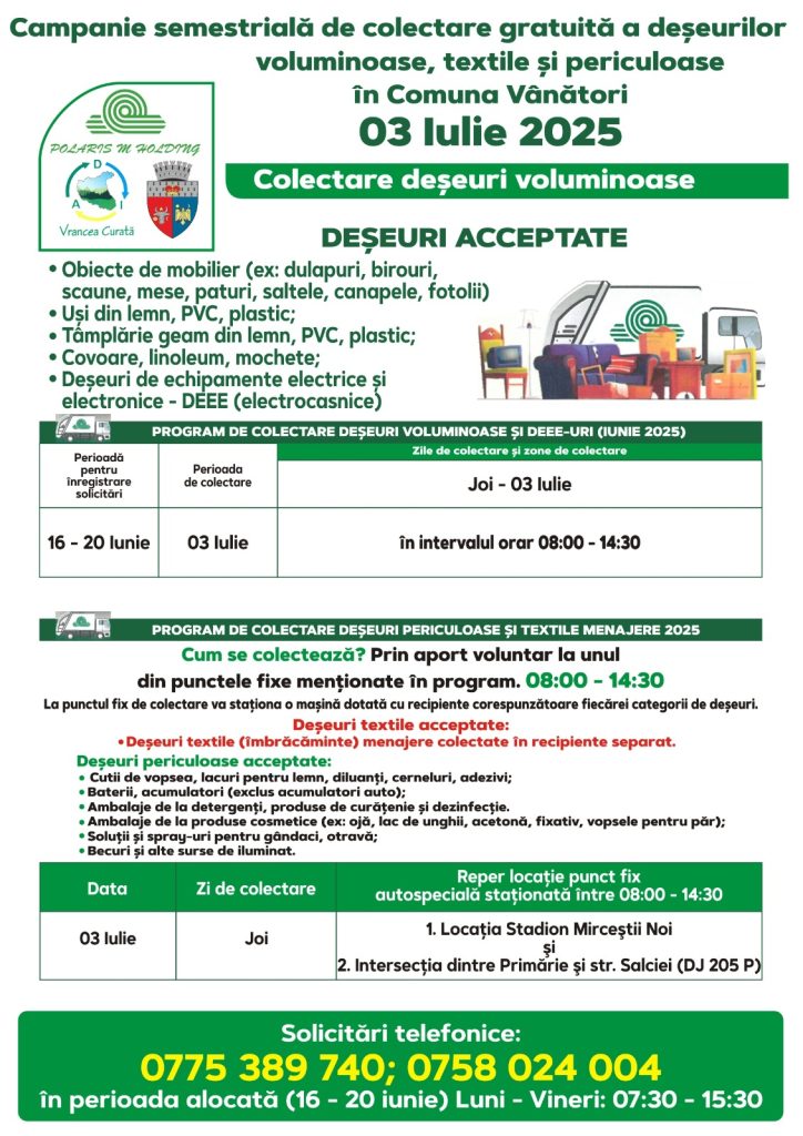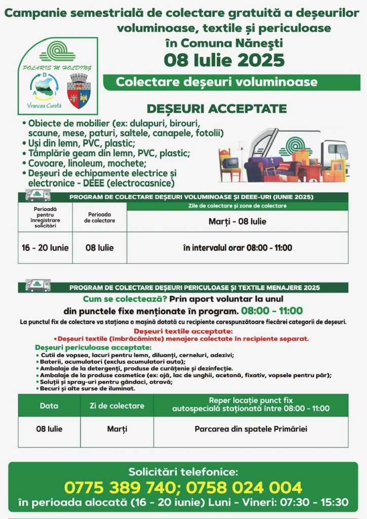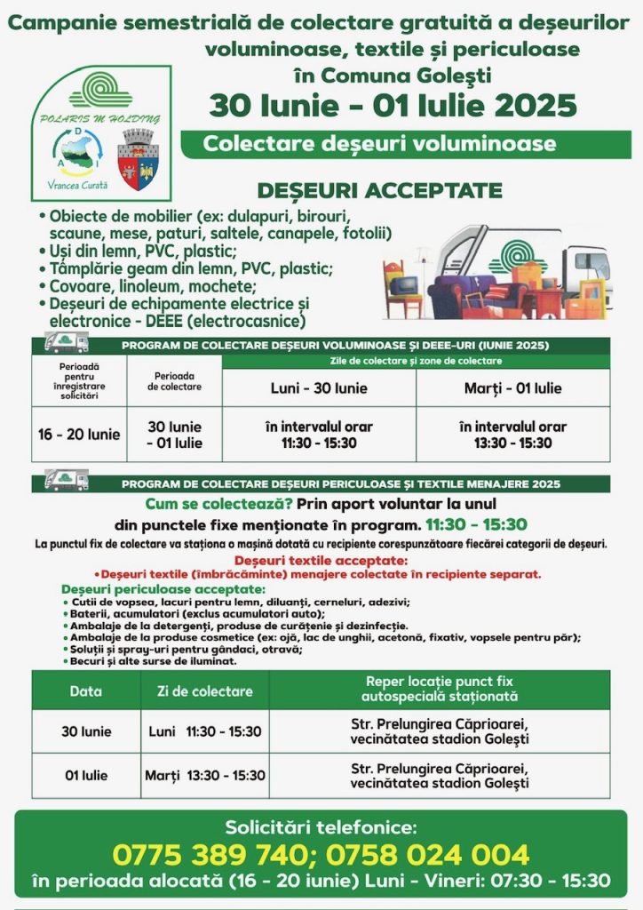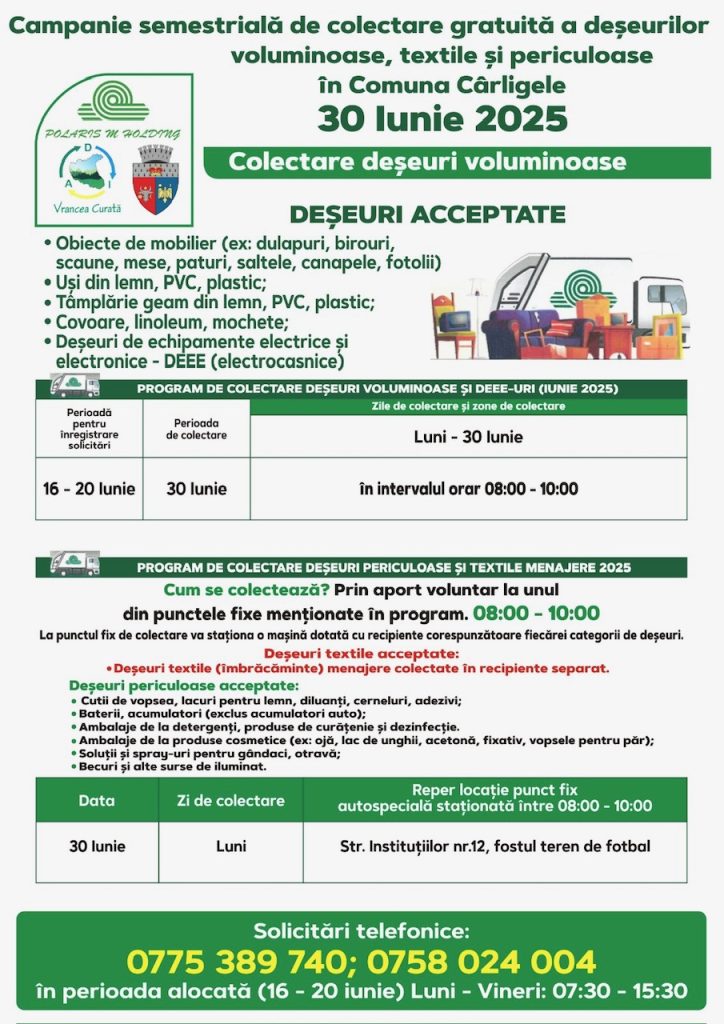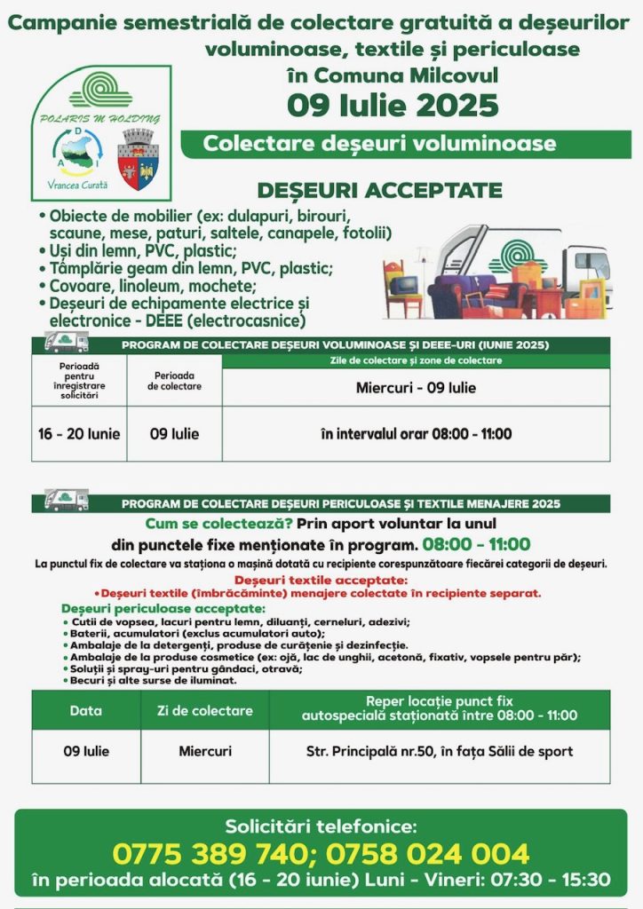 Polaris M Holding desfășoară o nouă campanie de colectare gratuită, oferind locuitorilor posibilitatea de a preda corect și responsabil anumite tipuri de deșeuri care nu pot fi aruncate în containerele obișnuite.