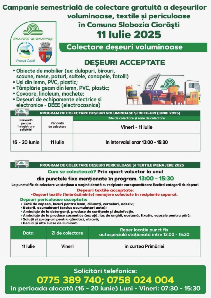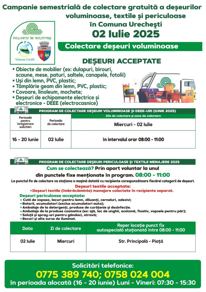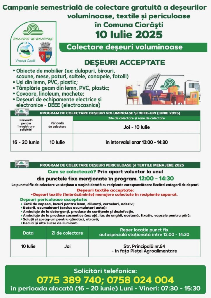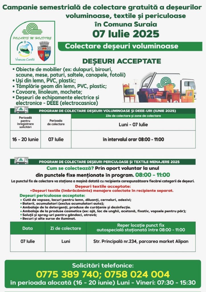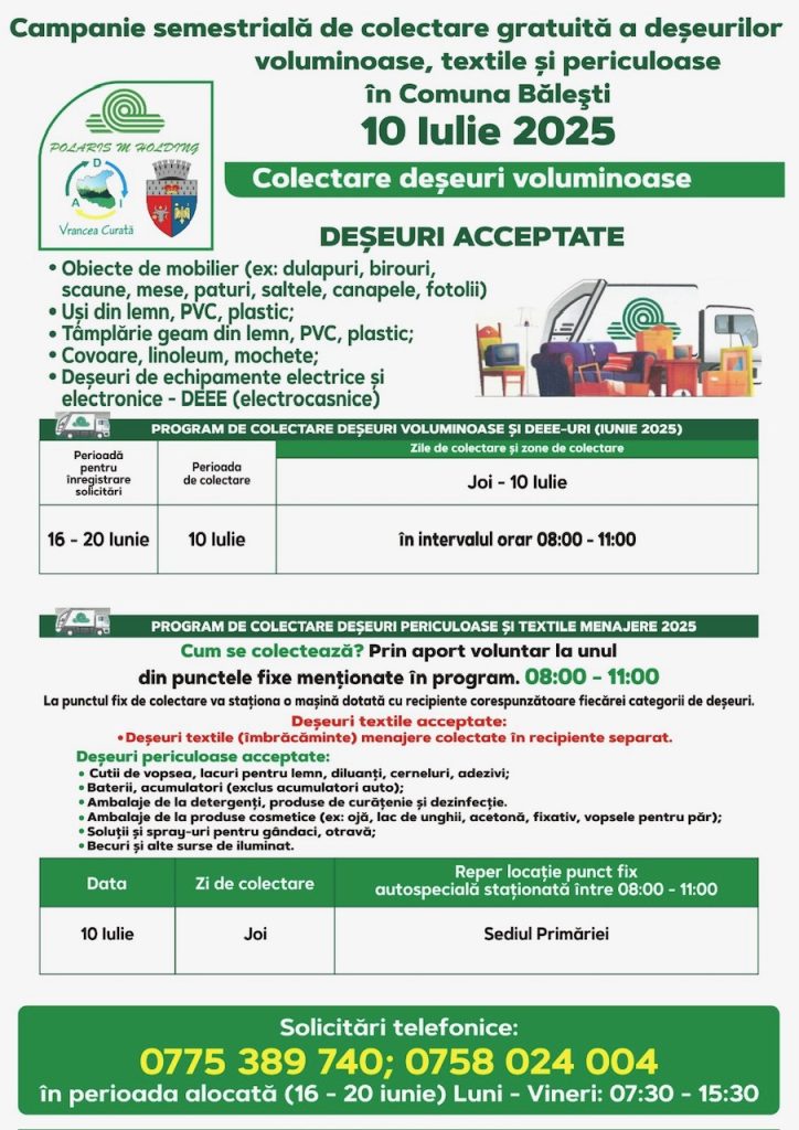 Polaris M Holding desfășoară o nouă campanie de colectare gratuită, oferind locuitorilor posibilitatea de a preda corect și responsabil anumite tipuri de deșeuri care nu pot fi aruncate în containerele obișnuite.