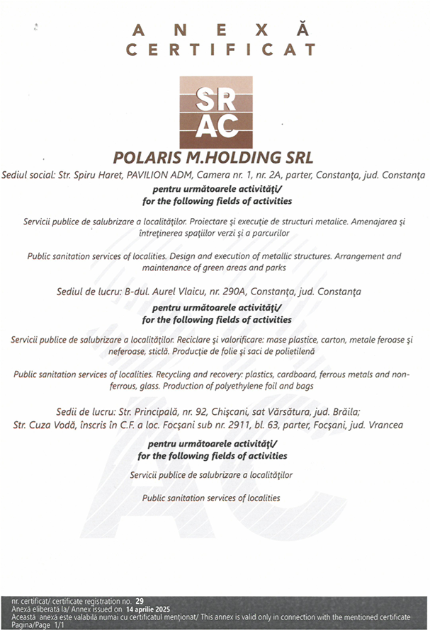 Polaris M Holding își desfășoară activitatea la cele mai înalte standarde de calitate, siguranță și protecție a mediului, fapt confirmat prin obținerea unor certificări internaționale recunoscute. Aceste acreditări atestă angajamentul companiei față de excelență și respectarea normelor specifice industriei de salubrizare și gestionare a deșeurilor.